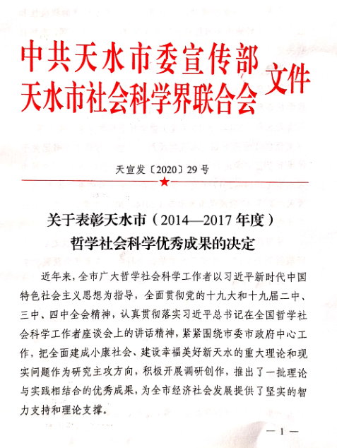 近日,经天水市委宣传部《关于表彰天水市(2014-2017年度)哲学社会科学优秀成果的决定》【2020】29号文件公布,诸侯快讯程晖、秦婕、王怀虎、段文义、陈玮等教师喜获优秀成果奖。